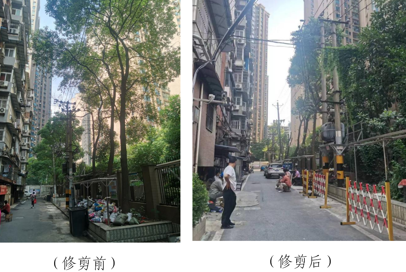 市园林绿化建管站在开展实事调研过程中了解到,永清小区中庭内树木繁杂、树枝叶过于茂盛并与多条高压线缠绕在一起,容易产生安全隐患引发火灾,但新天地社区缺乏相关绿化养护经验,导致此项问题迟迟得不到解决。