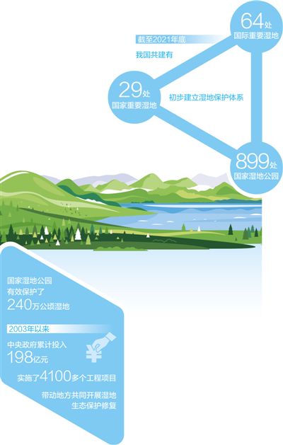 近年来,我国大力推进湿地保护修复,先后出台《关于加强湿地保护管理的通知》《湿地保护管理规定》《湿地保护修复制度方案》,28个省份出台省级湿地保护法规或规章。截至2021年底,我国共建有64处国际重要湿地、29处国家重要湿地、899处国家湿地公园,初步建立湿地保护体系。但与此同时,随着经济快速发展,保护和利用的矛盾日益凸显。“湿地遭受非法侵占、围垦、污染等现象时有发生,保护形势依然严峻。”国家林业和草原局湿地管理司司长吴志民表示。