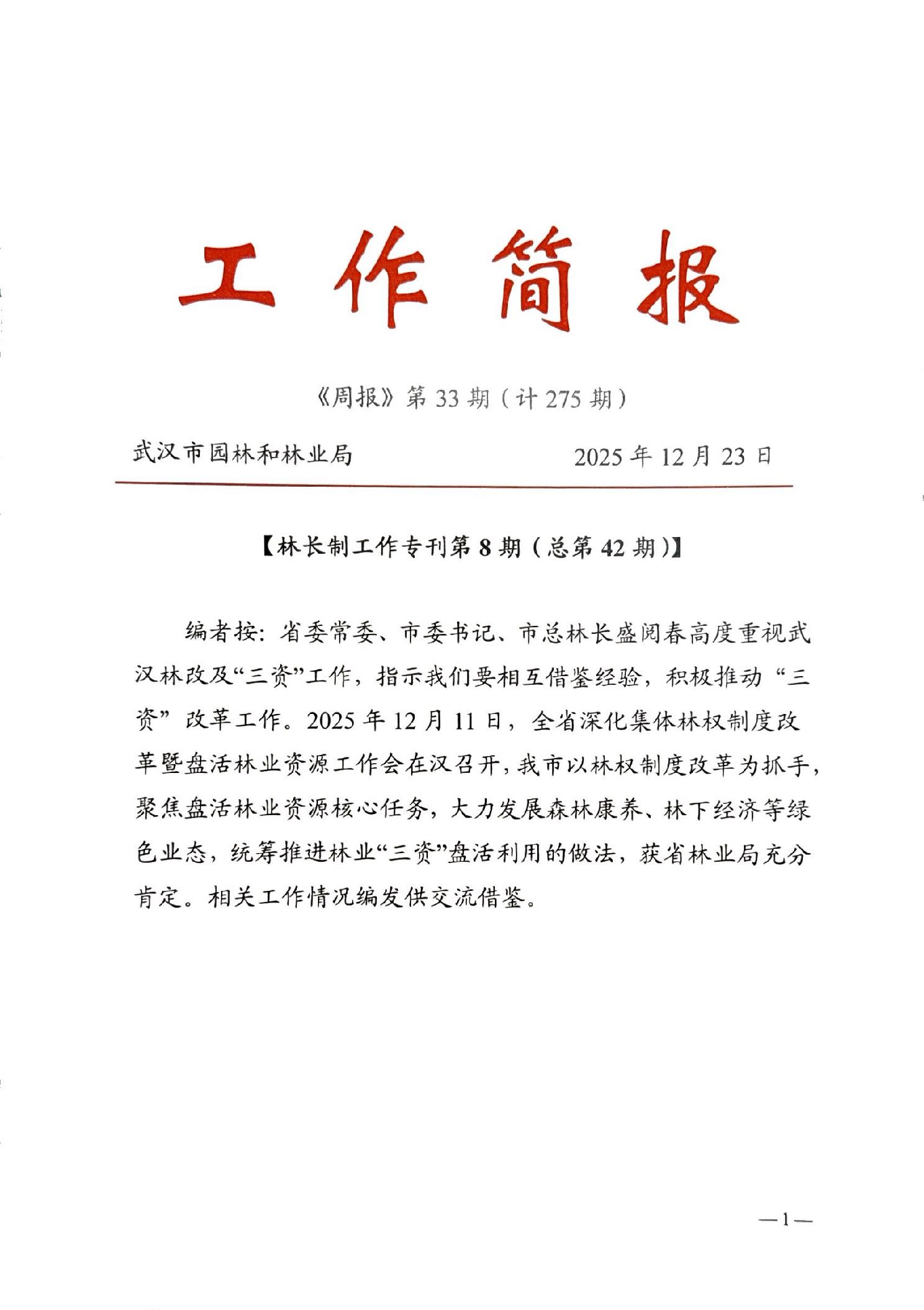 武汉市园林和林业局周报2025年第33期(计275期)林长制工作专刊第8期(总第42期)
